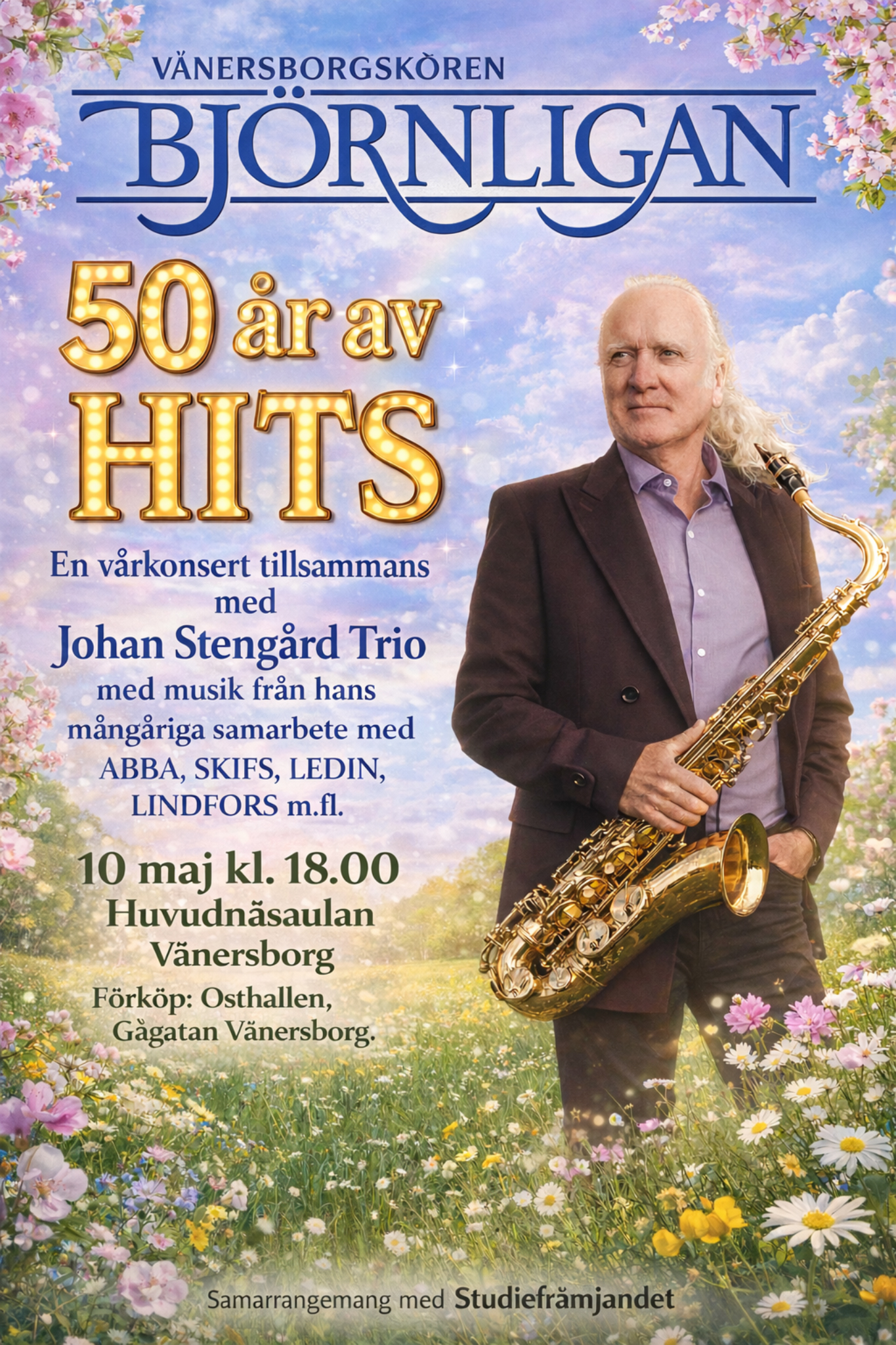 Nu har vi äntligen börjat sälja biljetterna till vår konsert, söndag den 10 maj. Vi gör då en konsert tillsammans med Johan Stengård, saxofon, Ulf Esborn, piano och Karin Funk, sång. Innehållet i konserten kommer från de 50 åren som Johan samarbetat med, som musiker. Det blir sånger av Lill Lindfors, Björn Skifs, Tomas Ledin, Jan Malmsjö, ABBA m.fl.